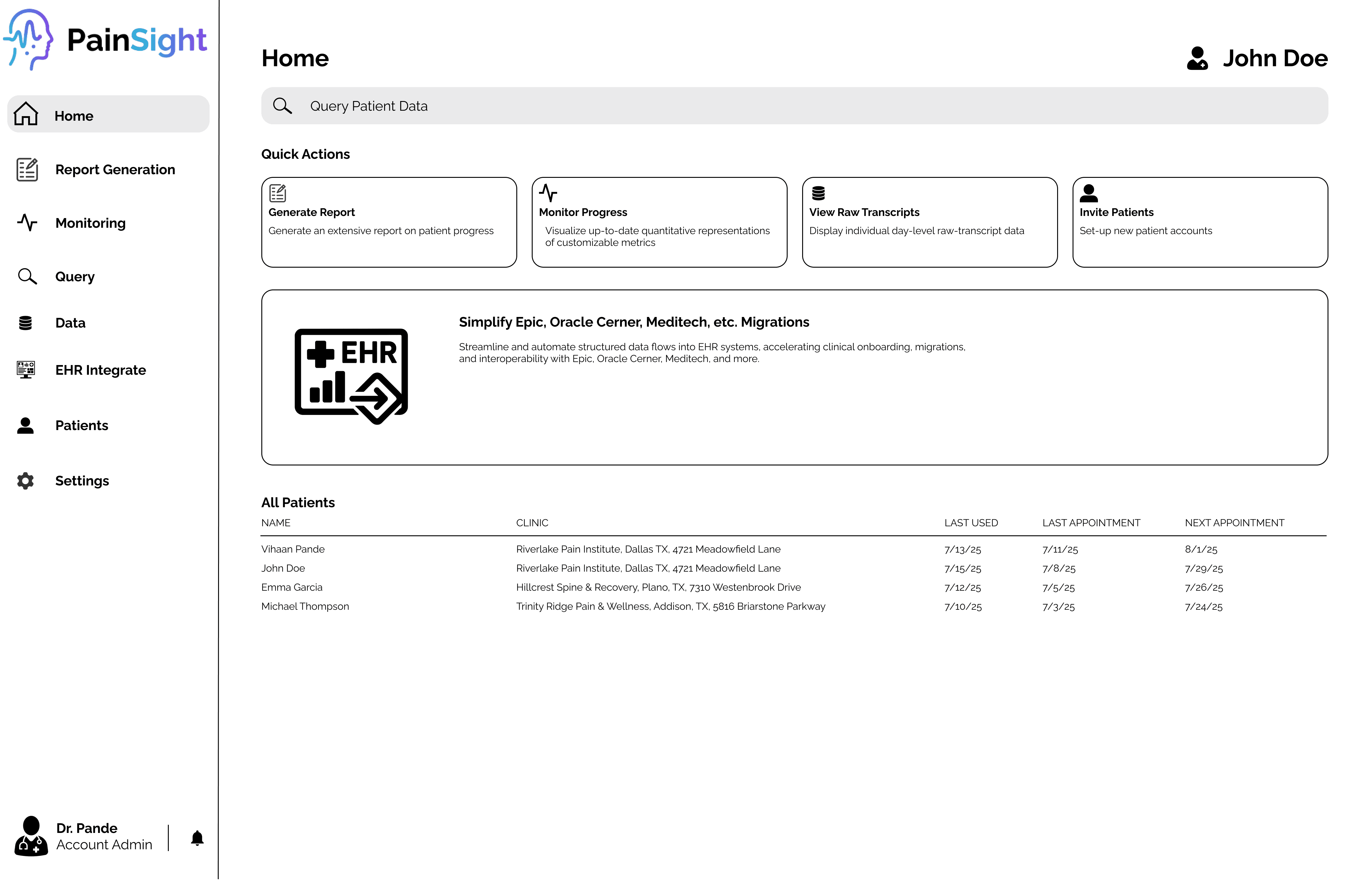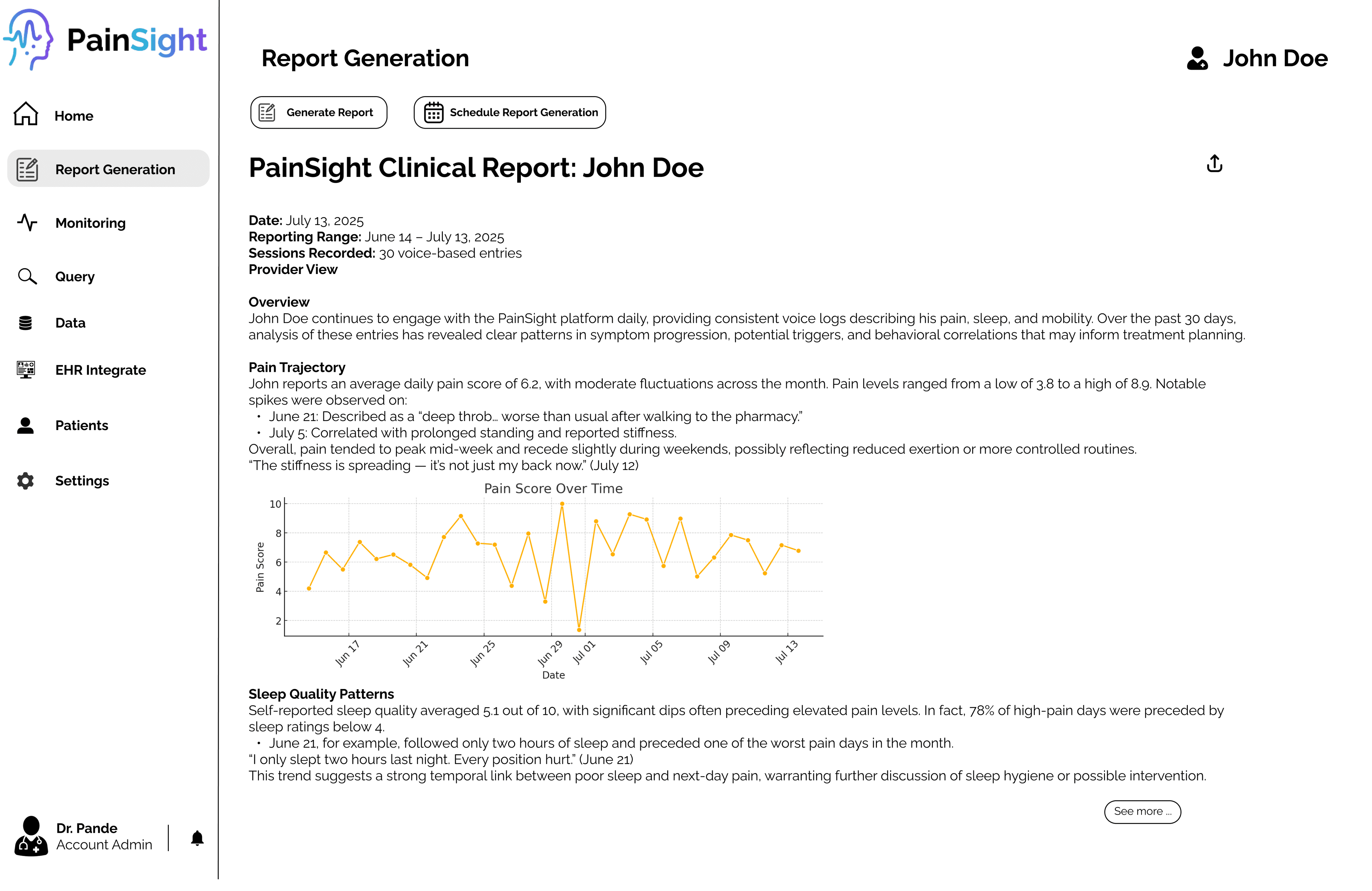 PainSight is an AI-powered pain tracking platform that helps physicians and researchers capture, analyze, and understand patient pain through short, voice-based check-ins.